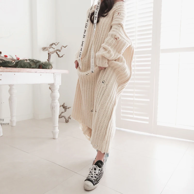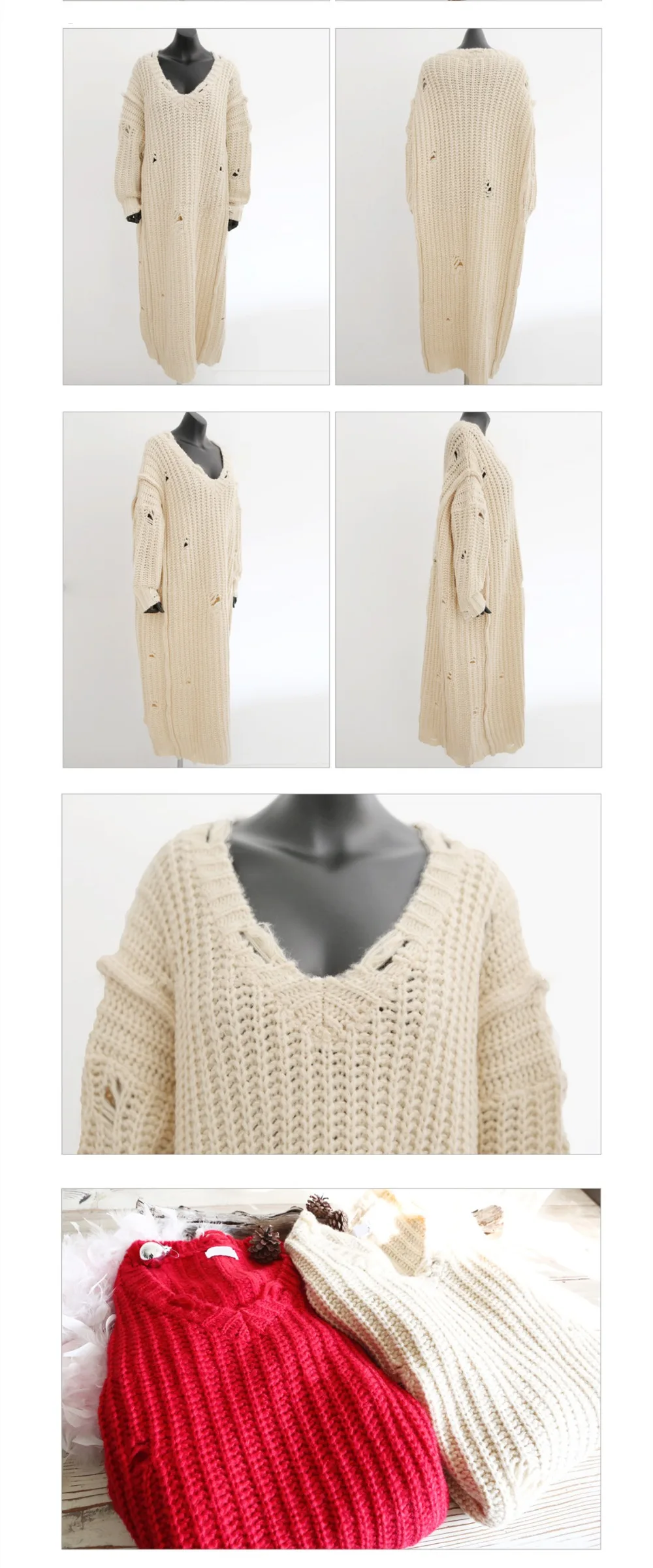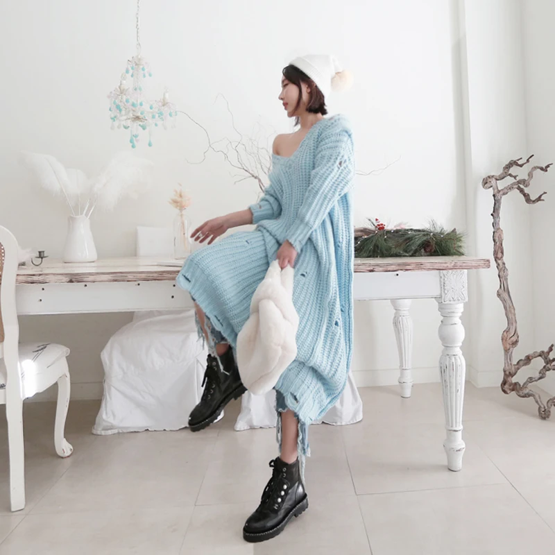 Grande taille femmes pull robes automne hiver tricoté lâche col en V trou épais cheville-longueur manches longues pull surdimensionné D88617Y