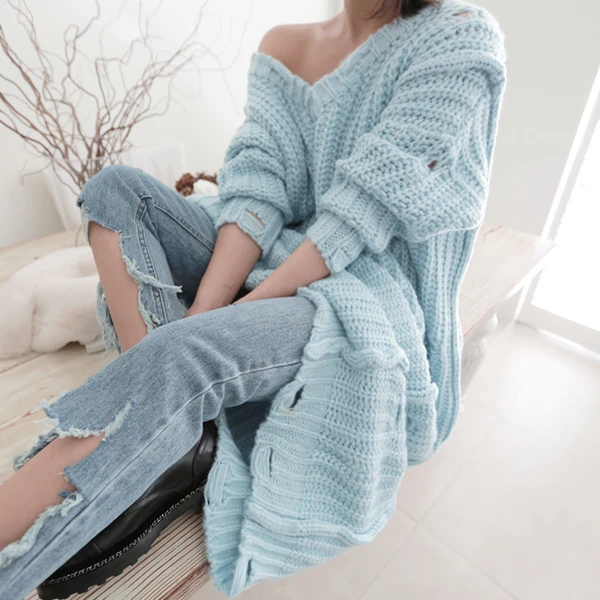 Pull Grande Taille Tricoté Lâche Col V Trou Épais Surdimensionné